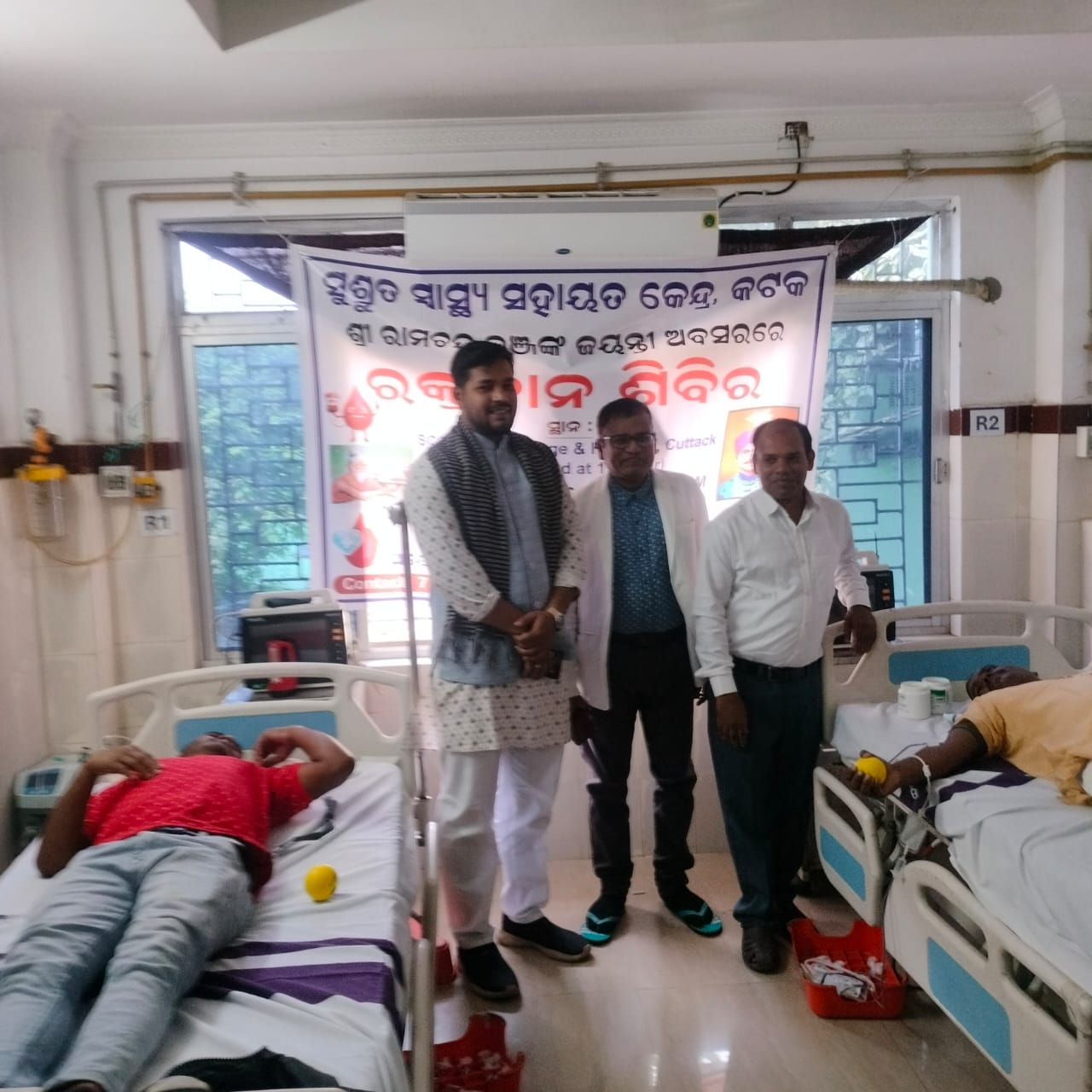 A blood donation camp was organized at SCB Medical College, Cuttack by Sushruta Swasthya Sahayata Kendra, Cuttack, on the occasion of the birth anniversary of Sriram Chandra Bhanj. The programme was inaugurated by Dr. Pravash Kumar Mohanty, Principal, Dental SCB Medical College, by lighting the ceremonial lamp. Sri D. Krishna Gopal, Secretary of Utkal Bipanna Sahayata Samiti (UBSS), was also present on the occasion. Volunteers gathered to observe the birth anniversary of Sri Ram Chandra Bhanj and actively participated in the blood donation drive. A total of 41 units of blood were collected and handed over to the Blood Bank of SCB Medical College for use in future medical emergencies.